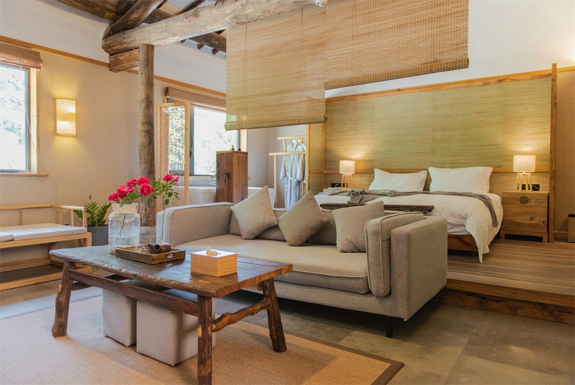 “望南读饮,依山而居” 属于新时代的传统建筑民宿与现代极简主义完美结合的诠释,砖石为墙、片石为瓦,古朴凝重,粗糙中透着细腻,古朴中显着别致,对比之下显得格外与众不同,独具匠心,土黄色的外墙面、质朴自然,别具一格,依山而建的房子从高到低有四层,楼梯将房间自然的分为纵向4块,每个房间都有着诗情画意的名字,宽坐、放空、借醉、聊适、安梦、歇话、问诗、知归、沐阳、试墨……不由得让人细细品味,走进房间更是让人眼前一亮,收购的老家具和独到的装饰品,无不体现出民宿主人热爱生活的态度,可谓是来了就不想走,走了还想来的民宿,房间内部每一处都是力求环保、健康,简单、精致、却不失温馨、每处都能让人感受到惊喜,忍不住坐下来品茶聊天,回归原本生活。